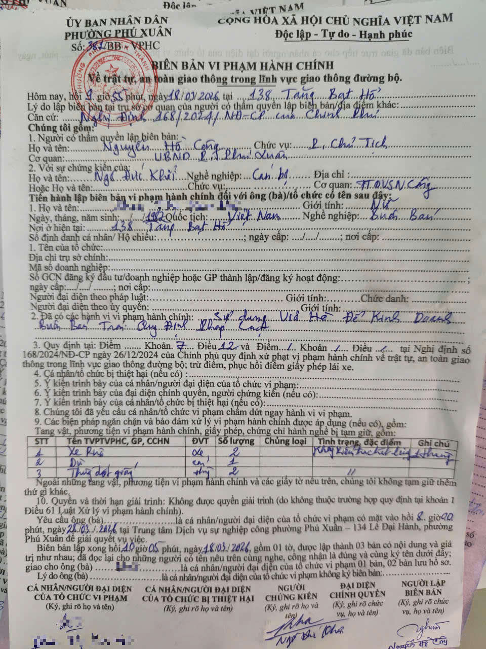 Sau khi tiếp nhận phản ánh, Trung tâm Dịch vụ sự nghiệp công đã cử Tổ công tác đến địa chỉ 138 Tăng Bạt Hổ để kiểm tra thực tế hiện trường. Qua kiểm tra, Tổ công tác đã làm việc với bà P.T.K.H là đại diện chủ cơ sở sản xuất, kinh doanh tại địa chỉ nêu trên. Kết quả kiểm tra cho thấy cơ sở có hành vi sử dụng vỉa hè để kinh doanh, buôn bán trái quy định của pháp luật.