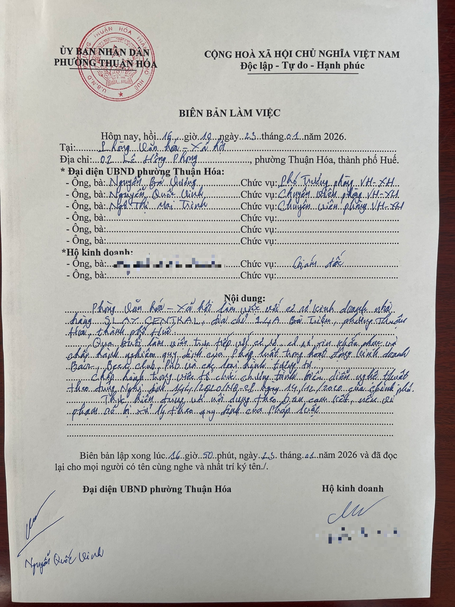 Sau khi tiếp nhận phản ánh, Công an thành phố đã chỉ đạo Công an phường Thuận Hóa tiến hành làm việc với chủ cơ sở kinh doanh Slay. Qua quá trình làm việc, lực lượng Công an đã yêu cầu cơ sở chấp hành nghiêm các quy định của Nhà nước về tiếng ồn trong hoạt động kinh doanh. Chủ cơ sở kinh doanh đã cam kết khắc phục, giảm thiểu tiếng ồn, bảo đảm không ảnh hưởng đến khu vực xung quanh theo quy định.
