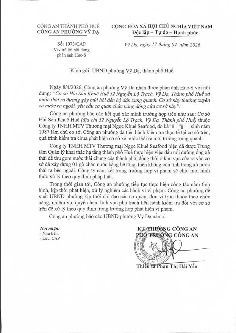 Sau khi tiếp nhận phản ánh, UBND phường đã giao Công an phường kiểm tra, xử lý. Công an phường báo cáo kết quả xác minh như sau: Cơ sở Hải sản Khuê Huế (địa chỉ 32 Nguyễn Lộ Trạch, phường Vỹ Dạ, thành phố Huế) thuộc Công ty TNHH MTV Thương mại Ngọc Khuê Seafood, do bà L.T.B (sinh năm 1987) làm chủ cơ sở. Qua kiểm tra thực tế, chưa phát hiện cơ sở xả nước thải ra môi trường xung quanh.