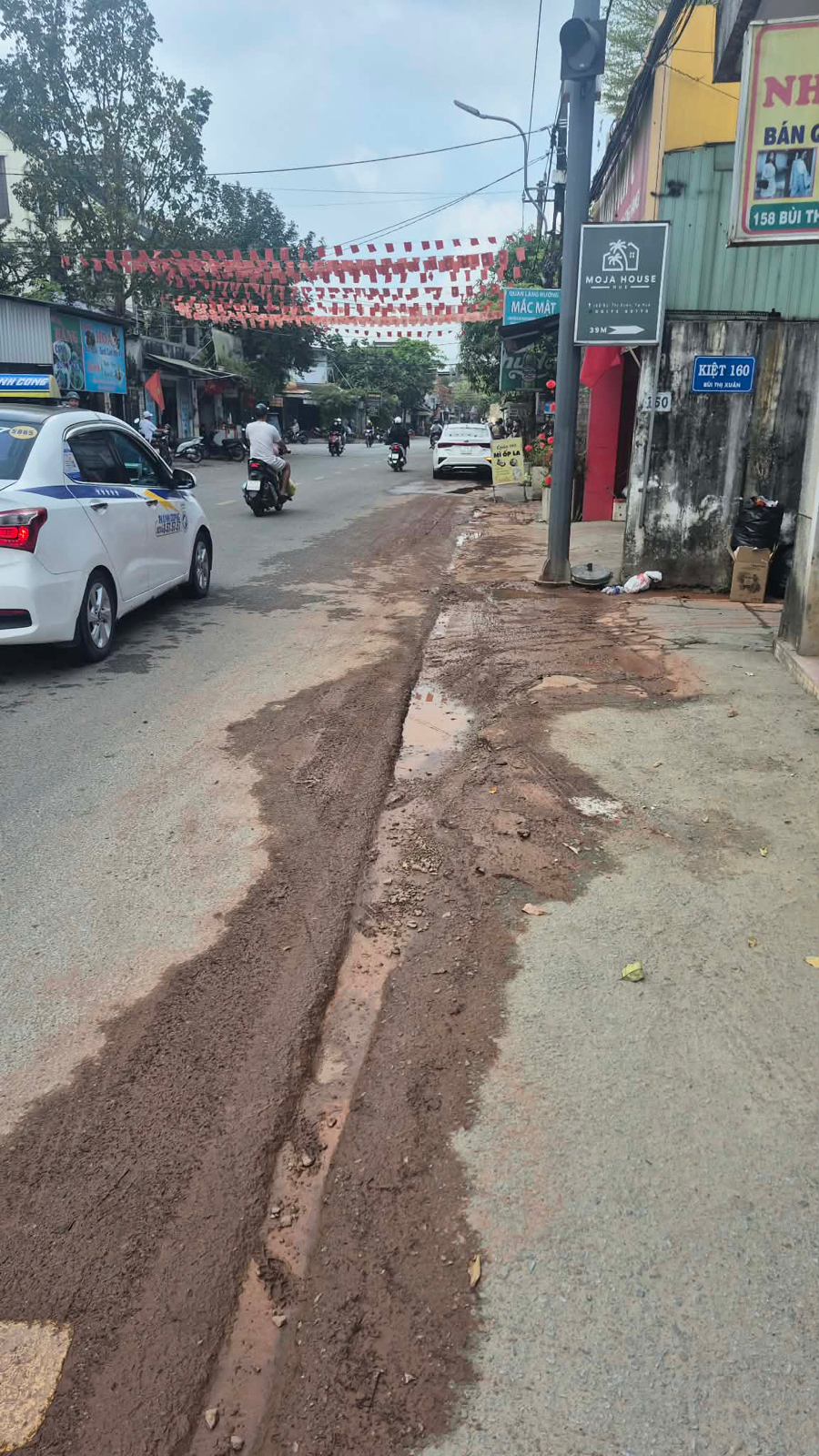 Quán Củi Coffe địa chỉ 164 Bùi Thị Xuân xịt rửa sân làm bùn đất đỏ chảy ra đường gây mất an toàn cho người tham gia giao thông, dễ gây trượt ngã và mất vệ sinh, mất mỹ quan đô thị. Ảnh được chụp ngày 25/2/2026