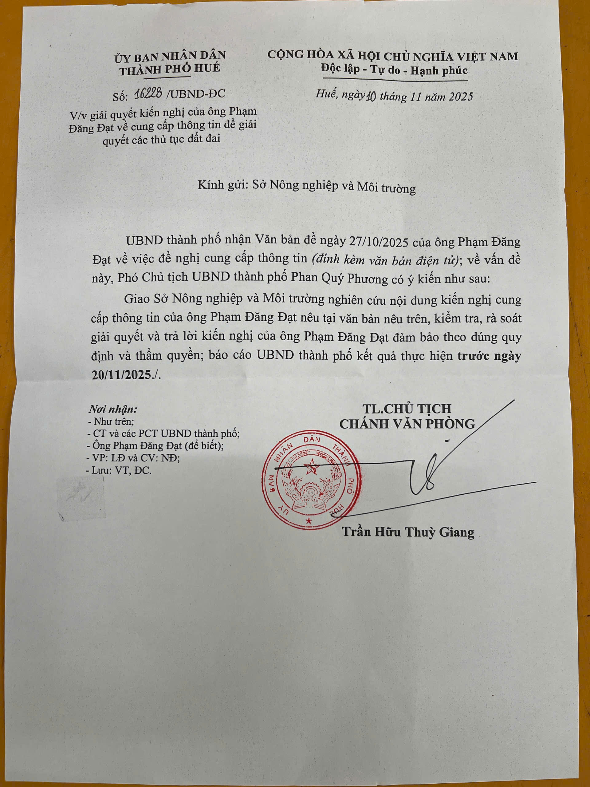 Ngày 12/11/2025 tôi nhận được Công văn số 16228/UBND-ĐC ngày 10/11/2025 của UBND Thành phố Huế về việc giải quyết kiến nghị của ông Phạm Đăng Đạt về cung cấp thông tin để giải quyết các thủ tục đất đai có nội dung cơ bản như sau: "...Giao Sở Nông nghiệp và Môi trường nghiên cứu nội dung kiến nghị cung cấp thông tin của ông Phạm Đăng Đạt nêu tại văn bản nêu trên, kiểm tra, rà soát giải quyết và trả lời kiến nghị của ông Phạm Đăng Đạt đảm bảo theo đúng quy định và thẩm quyền; báo cáo UBND thành phố kết quả thực hiện trước ngày 20/11/2025"