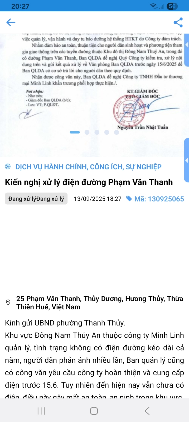 Tình trạng điện đường không có ở tuyến đường Phạm Văn Thanh đã kéo dài hơn nữa năm nay, người dân chúng tôi phản ánh quá nhiều lần, phường Thanh Thủy không trực tiếp chỉ đạo xử lý dứt điểm, chỉ giao Bql thực hiện nên Công ty Minh Linh xem thường, không thực hiện, tình trạng các phản ánh đều đang xử lý quá hạn từ nhiều tháng nay.