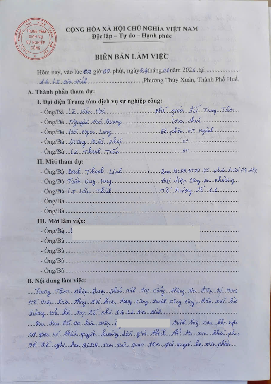 Trung tâm Dịch vụ sự nghiệp công phường Thuỷ Xuân tiến hành kiểm tra thực tế và lập biên bản, đồng thời yêu cầu ông L.H.P khắc phục, trả lại nguyên trạng ban đầu, nếu không chấp hành sẽ xử lý theo quy định của pháp luật (biên bản đính kèm).