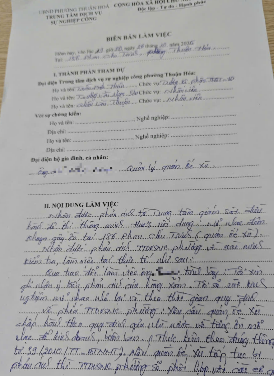 Trung tâm Dịch vụ sự nghiệp công phường Thuận Hoá chỉ đạo bộ phận liên quan tiến hành kiểm tra thực tế tại 186 Phan Chu Trinh, lực lượng đã tiến hành lập biên bản làm việc và nhắc nhở hộ kinh doanh. (Đính kèm hình ảnh)