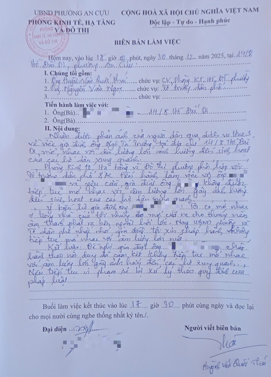 Phòng Kinh tế, hạ tầng và Đô thị phường An Cựu đã về làm việc với hộ ông N.T.T với nội dung nhắc nhở hộ gia đình không mở nhạc với âm lượng lớn gây ảnh hưởng đến các hộ gia đình xung quanh.
