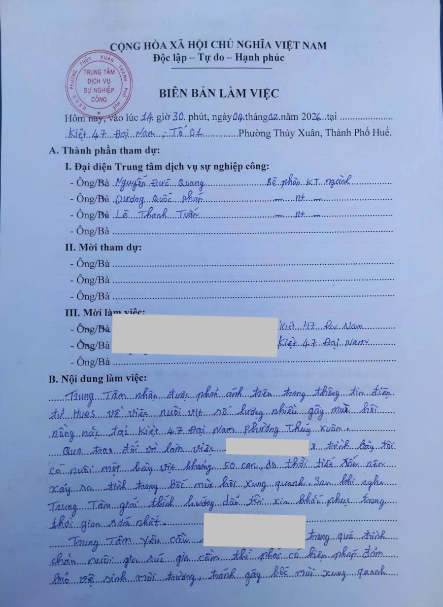 Trung tâm Dịch vụ sự nghiệp công phường Thuỷ Xuân tiến hành kiểm tra thực tế; đồng thời yêu cầu bà N.T.H trong quá trình nuôi gia súc gia cầm phải có biện pháp đảm bảo vệ sinh môi trường, tránh gây bốc mùi xung quanh làm ảnh hưởng đến các hộ liền kề, nếu không chấp hành hoặc cố tình vi phạm sẽ bị xử lý theo quy định của pháp luật (đính kèm biên bản).