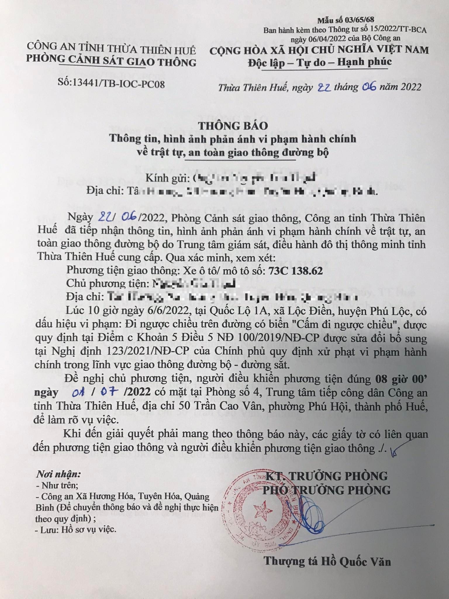 Qua hình ảnh phản ánh, Phòng Cảnh sát giao thông xác định lỗi vi phạm của người điều khiển phương tiện 73C13862 như sau: Đi ngược chiều trên đường có biển cấm đi ngược chiều, quy định tại điểm c, khoản 5, điều 5 Nghị định 100/2019/NĐ-CP được sửa đổi, bổ sung tại Nghị định 123/NĐ-CP ngày 28/12/2021.