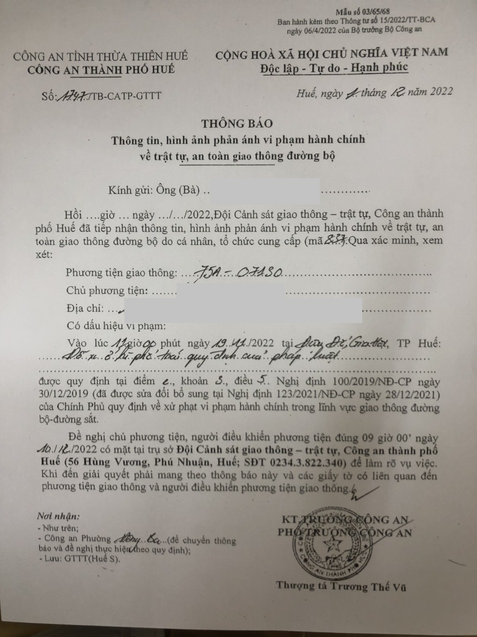 Vấn đề Ông/Bà phản ánh, Công an tỉnh đã chỉ đạo Công an thành phố Huế xin thông báo kết quả xử lý như sau: