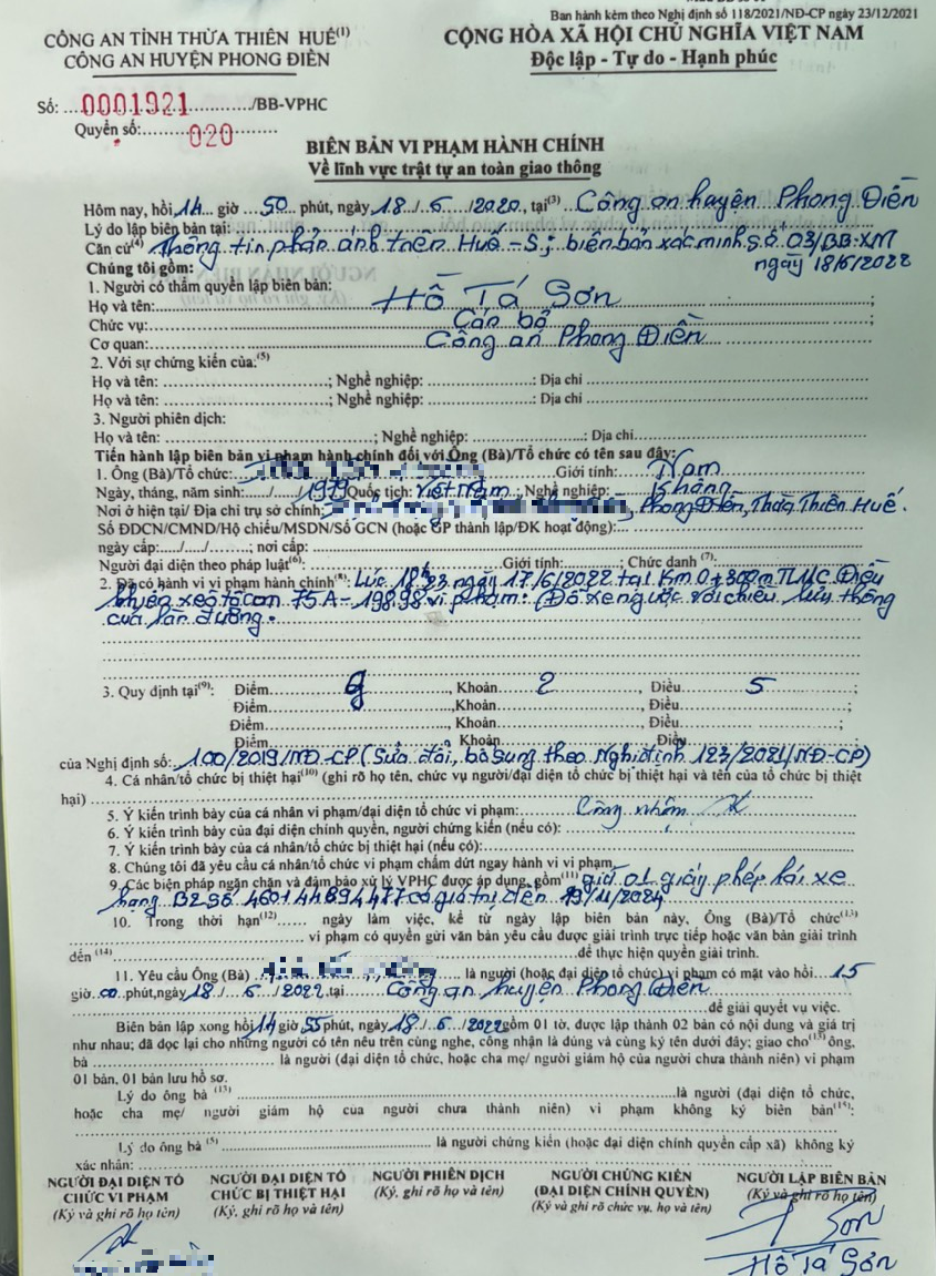 Công an huyện Phong Điền đã lập biên bản vi phạm hành chính, ra quyết định xử phạt đối với chủ phương tiện về lỗi trên, phạt tiền 500.000đ.