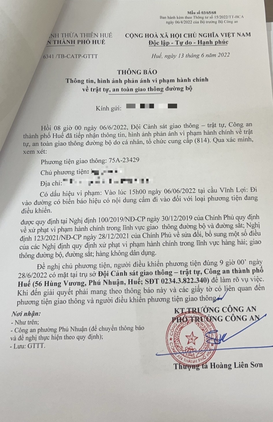 Vấn đề Ông/Bà phản ánh, Công an tỉnh đã chỉ đạo Công an thành phố Huế kiểm tra và trả lời như sau: