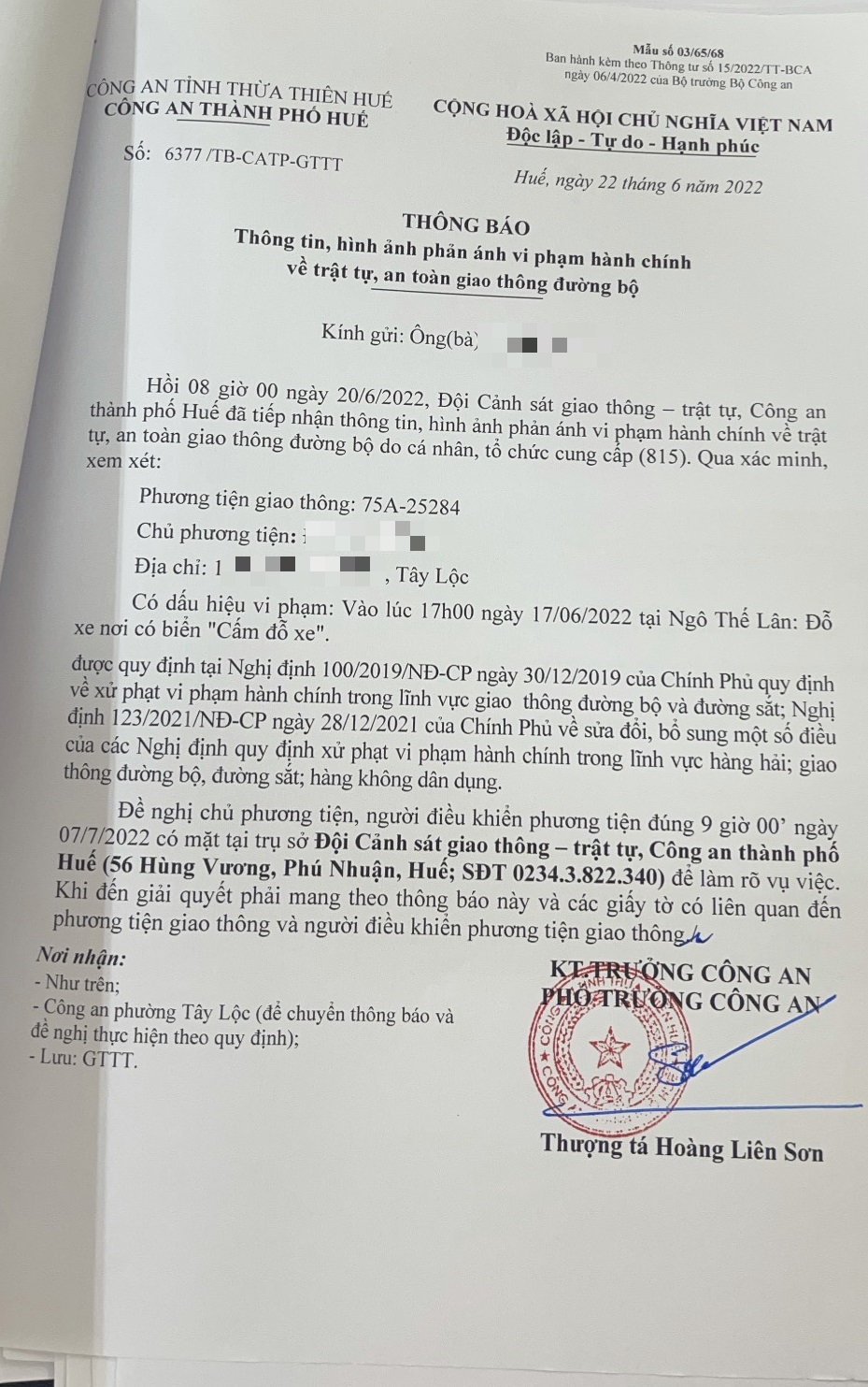 Công an thành phố đã lập hồ sơ, thông báo chủ phương tiện đến làm việc vào ngày 07/7/2022. Tuy nhiên, hiện chủ phương tiện vẫn chưa trình diện tại cơ quan. Công an thành phố sẽ gửi thông báo cho cơ quan đăng kiểm để đưa phương tiện vào cảnh báo trên Chương trình Quản lý kiểm định.