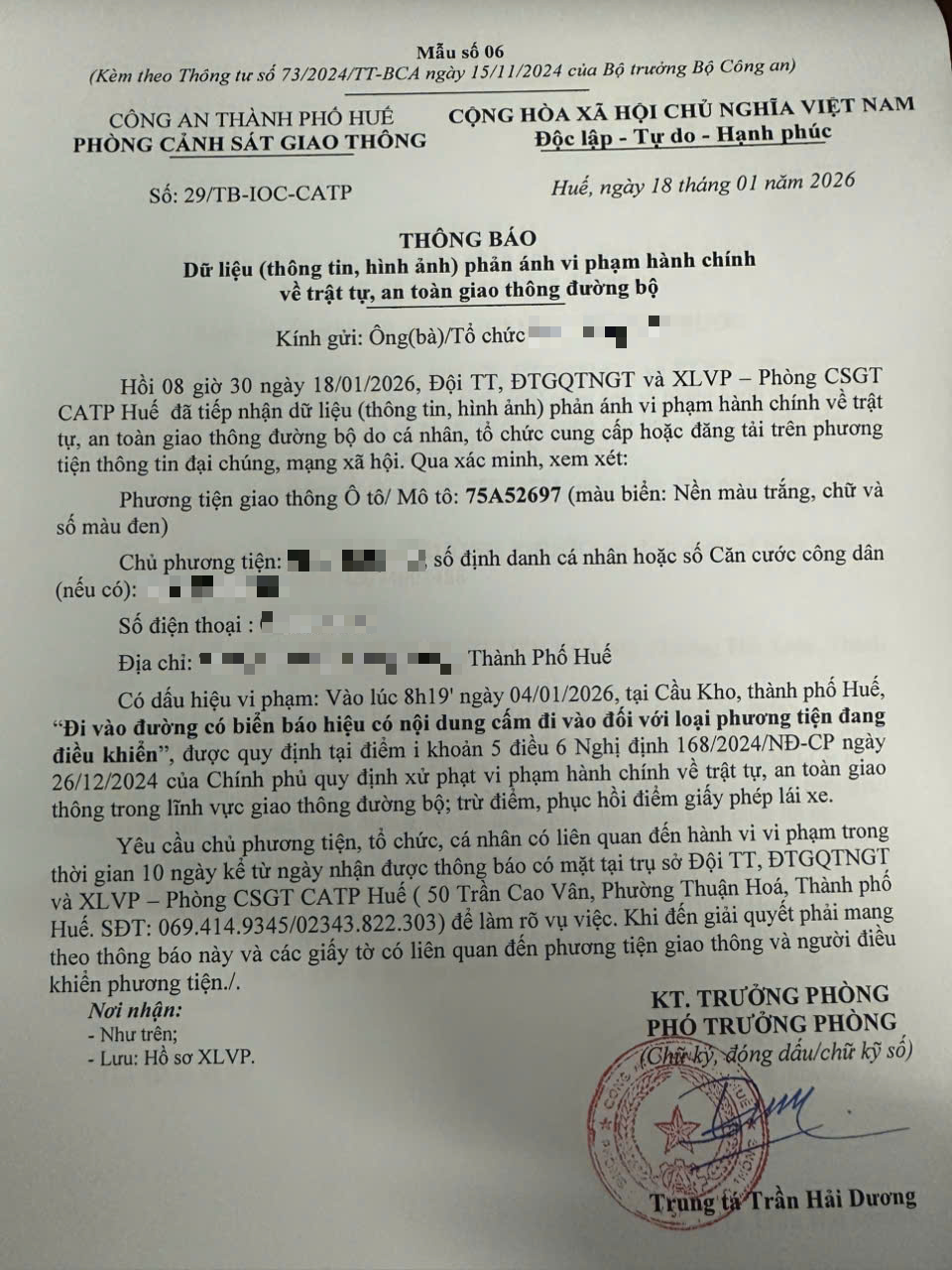 Qua hình ảnh phản ánh, người điều khiển phương tiện BKS 75A52697 có dấu hiệu vi phạm lỗi: Đi vào đường có biển báo hiệu có nội dung cấm đi vào đối với loại phương tiện đang điều khiển, quy định tại điểm i, khoản 5, điều 6 Nghị định số 168/2024/NĐ-CP ngày 26/12/2024 của Chính phủ quy định xử phạt vi phạm hành chính về trật tự, an toàn giao thông trong lĩnh vực giao thông đường bộ; trừ điểm, phục hồi điểm giấy phép lái xe.