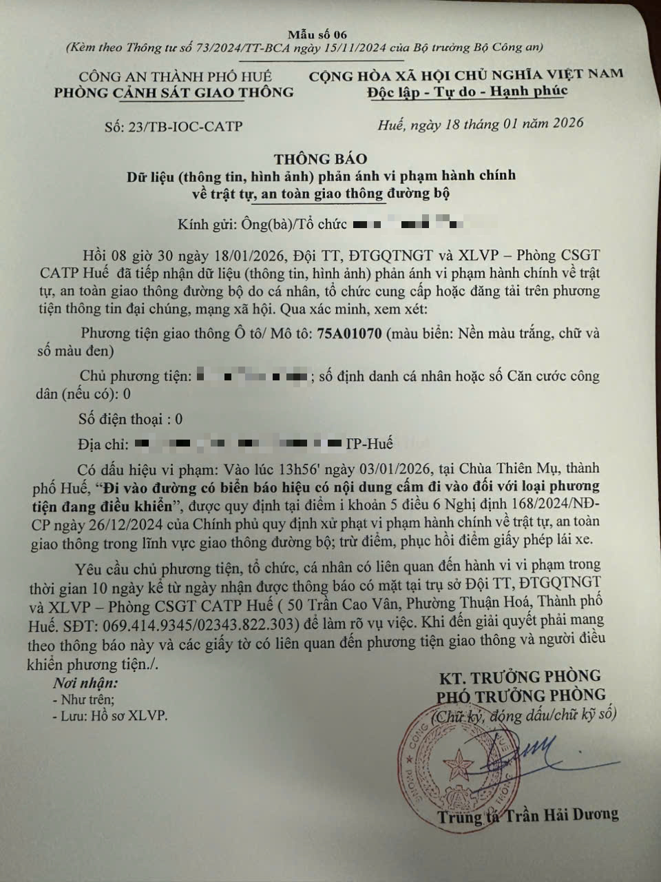 Qua hình ảnh phản ánh, Phòng Cảnh sát giao thông xác định lỗi vi phạm của người điều khiển phương tiện 75A01070 như sau: Đi vào đường có biển báo hiệu có nội dung cấm đi vào đối với loại phương tiện đang điều khiển, được quy định tại Điểm i khoản 5 Điều 6 Nghị định số 168/2024/NĐ-CP ngày 26/12/2024 của Chính phủ.
