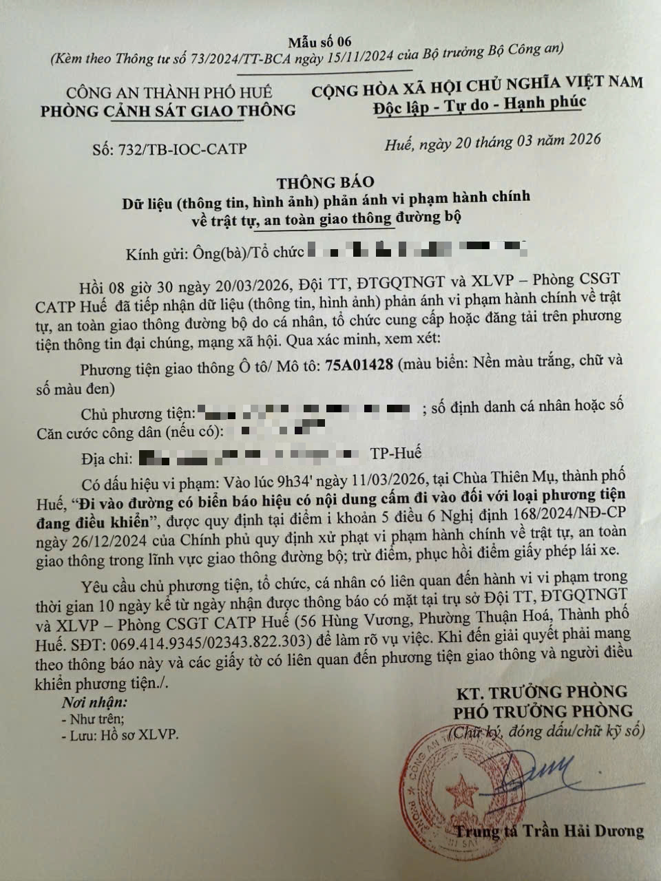 Qua hình ảnh phản ánh, Phòng Cảnh sát giao thông xác định lỗi vi phạm của người điều khiển phương tiện 75A01428 như sau: “Đi vào đường có biển báo hiệu có nội dung cấm đi vào đối với loại phương tiện đang điều khiển”, quy định tại điểm i, khoản 5, điều 6 Nghị định 168/2024/NĐ-CP.