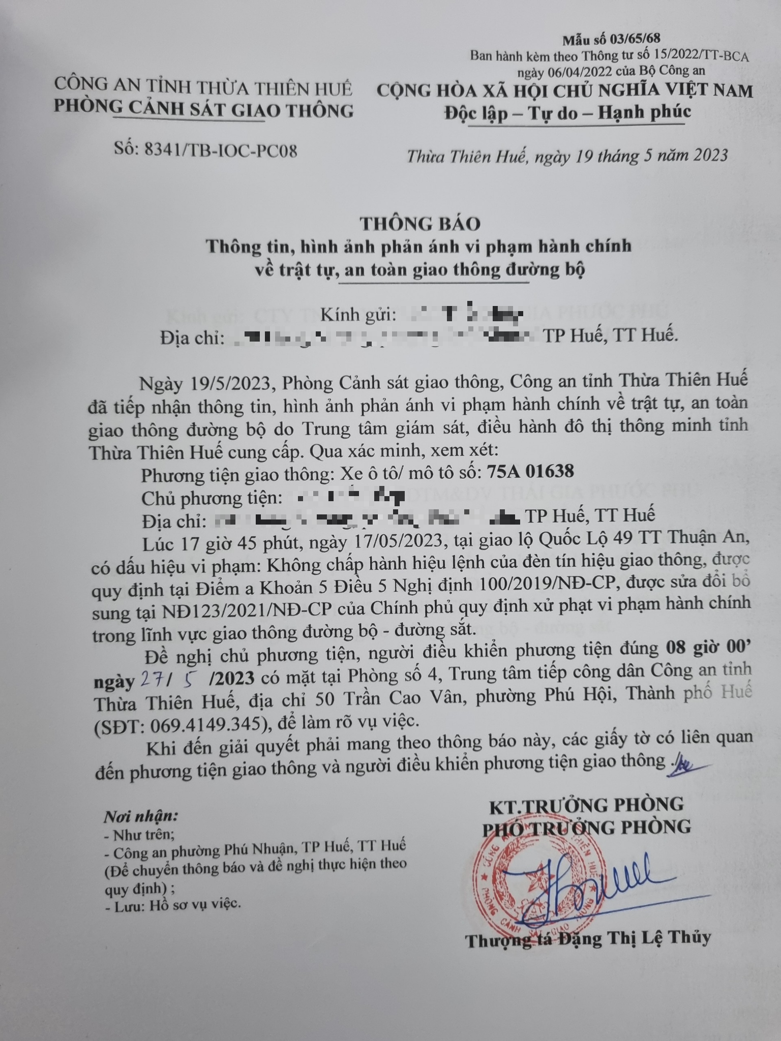 Phòng Cảnh sát giao thông đã gửi thông báo yêu cầu chủ phương tiện đến làm việc theo quy định của pháp luật. Tuy nhiên, đến nay, chủ phương tiện vẫn chưa đến làm việc theo ngày hẹn như yêu cầu. Phòng Cảnh sát giao thông sẽ tiến hành gửi thông báo cho cơ quan đăng kiểm để đưa vào cảnh báo trên Chương trình Quản lý kiểm định.