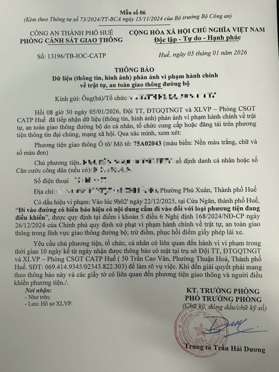 Qua hình ảnh phản ánh, Phòng Cảnh sát giao thông xác định lỗi vi phạm của người điều khiển phương tiện 75A02043 như sau: Đi vào đường có biển báo hiệu có nội dung cấm đi vào đối với loại phương tiện đang điều khiển, được quy định tại Điểm i khoản 5 Điều 6 Nghị định số 168/2024/NĐ-CP ngày 26/12/2024 của Chính phủ.