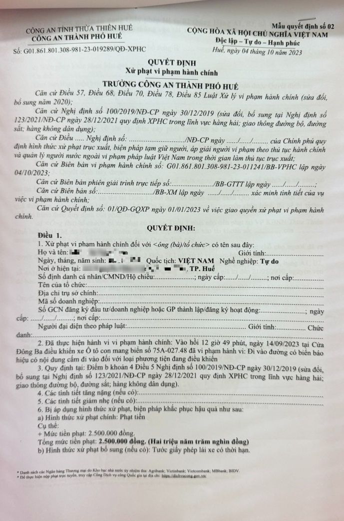 Công an thành phố đã ra Quyết định xử phạt 2.500.000 đồng, tước quyền sử dụng Giấy phép lái xe 03 tháng đối với người điều khiển phương tiện.