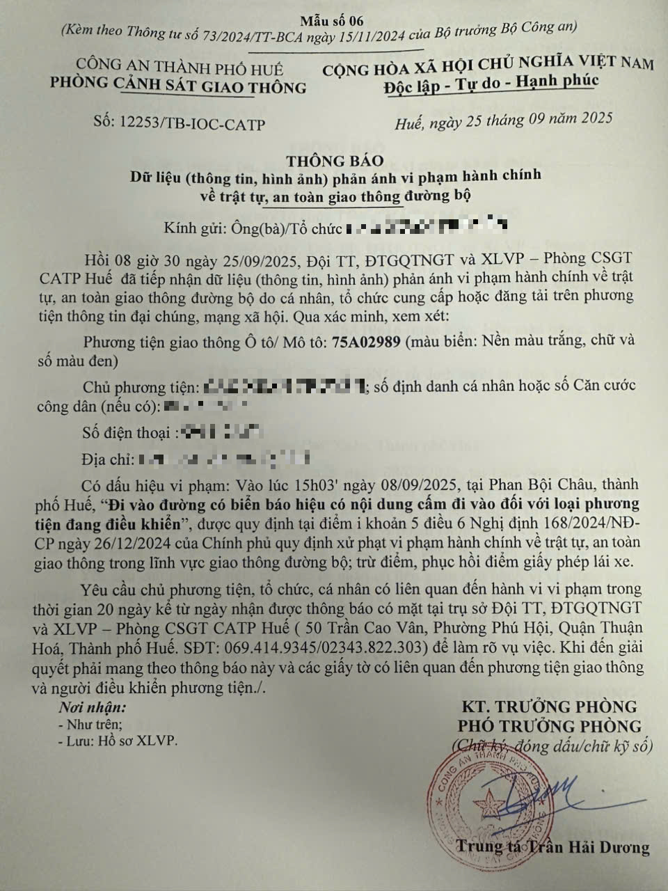 Qua hình ảnh phản ánh, Phòng Cảnh sát giao thông xác định lỗi vi phạm của người điều khiển phương tiện 75A02989 như sau: Đi vào đường có biển báo hiệu có nội dung cấm đi vào đối với loại phương tiện đang điều khiển, được quy định tại Điểm i khoản 5 Điều 6 Nghị định số 168/2024/NĐ-CP ngày 26/12/2024 của Chính phủ.