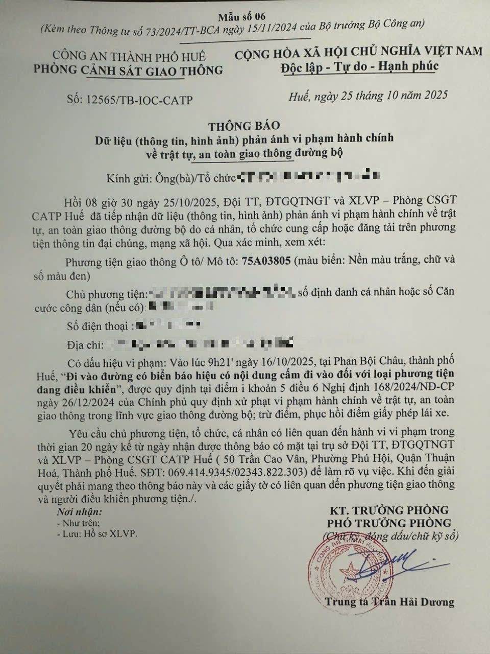 Qua hình ảnh phản ánh, Phòng Cảnh sát giao thông xác định lỗi vi phạm của người điều khiển phương tiện 75A03805 như sau: Đi vào đường có biển báo hiệu có nội dung cấm đi vào đối với loại phương tiện đang điều khiển, được quy định tại Điểm i khoản 5 Điều 6 Nghị định số 168/2024/NĐ-CP ngày 26/12/2024 của Chính phủ.