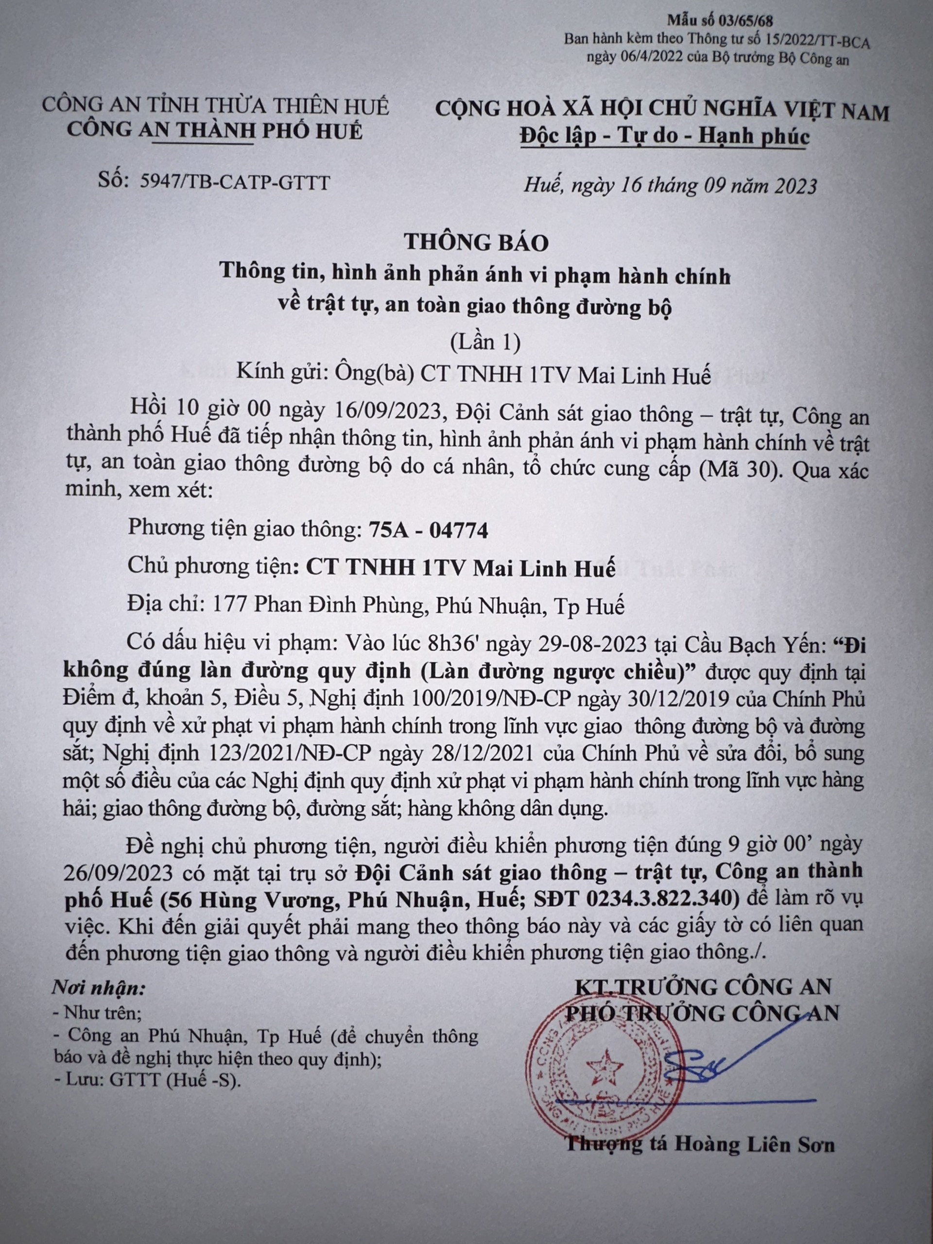 Công an thành phố cập nhật kết quả: Qua xác minh làm việc với chủ phương tiện vi phạm lỗi: Không chấp hành hiệu lệnh, chỉ dẫn của vạch kẻ đường, quy định tại điểm a, khoản 1, điều 5 Nghị định 100/2019/NĐ-CP được sửa đổi, bổ sung tại Nghị định 123/NĐ-CP ngày 28/12/2021. Ra Quyết định xử phạt 350.000đ. (Đính kèm Quyết định)
