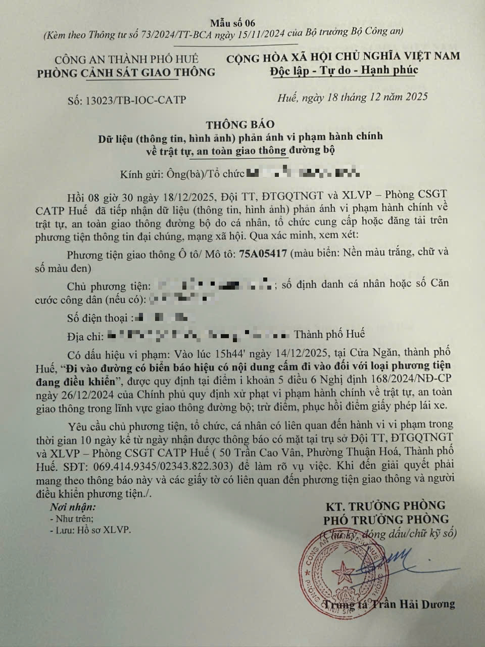 Qua hình ảnh phản ánh, Phòng Cảnh sát giao thông xác định lỗi vi phạm của người điều khiển phương tiện 75A05417 như sau: Đi vào đường có biển báo hiệu có nội dung cấm đi vào đối với loại phương tiện đang điều khiển, được quy định tại Điểm i khoản 5 Điều 6 Nghị định số 168/2024/NĐ-CP ngày 26/12/2024 của Chính phủ.