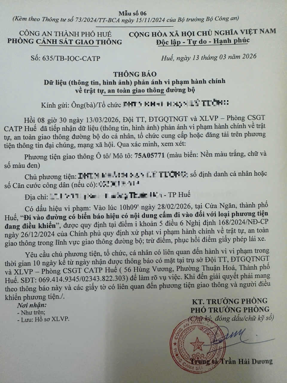 Qua hình ảnh phản ánh, người điều khiển phương tiện BKS 75A05771 có dấu hiệu vi phạm lỗi: Đi vào đường có biển báo hiệu có nội dung cấm đi vào đối với loại phương tiện đang điều khiển, quy định tại điểm i, khoản 5, điều 6 Nghị định số 168/2024/NĐ-CP ngày 26/12/2024 của Chính phủ quy định xử phạt vi phạm hành chính về trật tự, an toàn giao thông trong lĩnh vực giao thông đường bộ; trừ điểm, phục hồi điểm giấy phép lái xe.