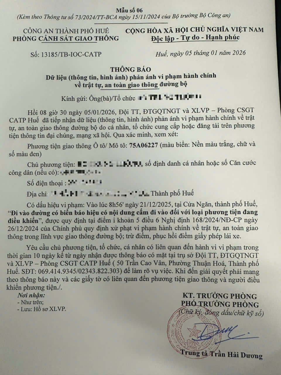 Qua hình ảnh phản ánh, Phòng Cảnh sát giao thông xác định lỗi vi phạm của người điều khiển phương tiện 75A06227 như sau: Đi vào đường có biển báo hiệu có nội dung cấm đi vào đối với loại phương tiện đang điều khiển, được quy định tại Điểm i khoản 5 Điều 6 Nghị định số 168/2024/NĐ-CP ngày 26/12/2024 của Chính phủ.