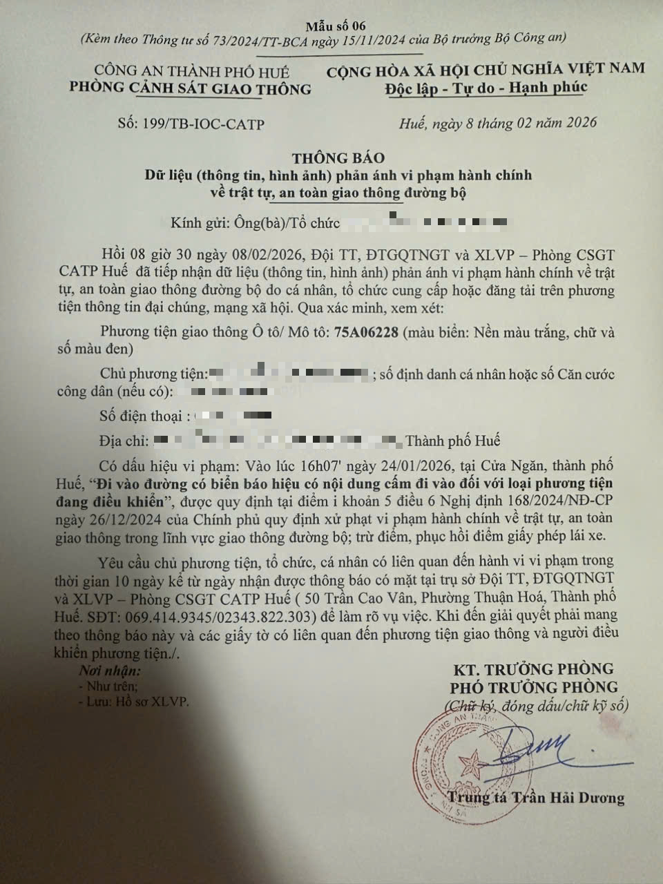 Qua hình ảnh phản ánh, người điều khiển phương tiện BKS 75A06228 có dấu hiệu vi phạm lỗi: Đi vào đường có biển báo hiệu có nội dung cấm đi vào đối với loại phương tiện đang điều khiển, quy định tại điểm i, khoản 5, điều 6 Nghị định số 168/2024/NĐ-CP ngày 26/12/2024 của Chính phủ quy định xử phạt vi phạm hành chính về trật tự, an toàn giao thông trong lĩnh vực giao thông đường bộ; trừ điểm, phục hồi điểm giấy phép lái xe.