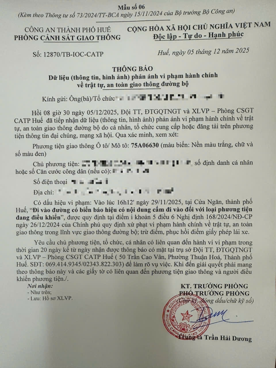 Qua hình ảnh phản ánh, Phòng Cảnh sát giao thông xác định lỗi vi phạm của người điều khiển phương tiện 75A06630 như sau: Đi vào đường có biển báo hiệu có nội dung cấm đi vào đối với loại phương tiện đang điều khiển, được quy định tại Điểm i khoản 5 Điều 6 Nghị định số 168/2024/NĐ-CP ngày 26/12/2024 của Chính phủ.