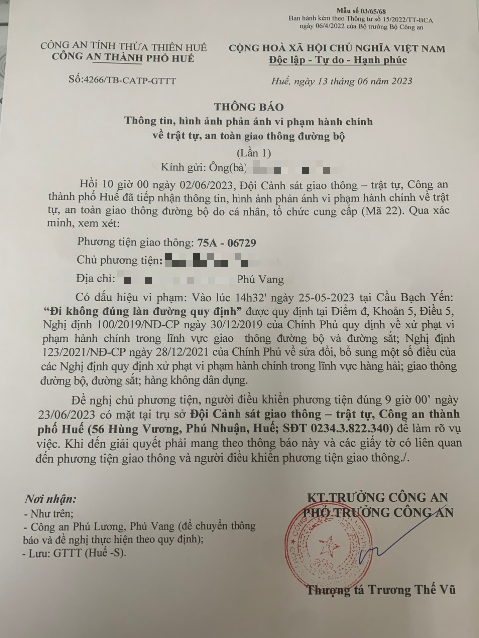 Công an thành phố cập nhật kết quả: Qua xác minh làm việc với chủ phương tiện vi phạm lỗi: Không chấp hành hiệu lệnh, chỉ dẫn của vạch kẻ đường, quy định tại điểm a, khoản 1, điều 5 Nghị định 100/2019/NĐ-CP được sửa đổi, bổ sung tại Nghị định 123/NĐ-CP ngày 28/12/2021. Ra Quyết định xử phạt 350.000đ. (Đính kèm Quyết định)