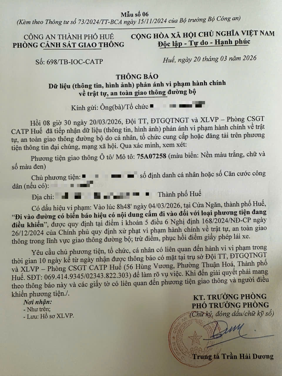 Qua hình ảnh phản ánh, Phòng Cảnh sát giao thông xác định lỗi vi phạm của người điều khiển phương tiện 75A07258 như sau: “Đi vào đường có biển báo hiệu có nội dung cấm đi vào đối với loại phương tiện đang điều khiển”, quy định tại điểm i, khoản 5, điều 6 Nghị định 168/2024/NĐ-CP.