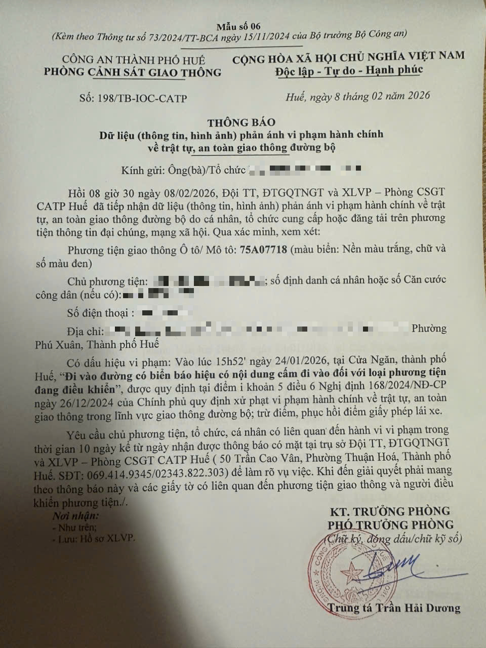 Qua hình ảnh phản ánh, người điều khiển phương tiện BKS 75A07718 có dấu hiệu vi phạm lỗi: Đi vào đường có biển báo hiệu có nội dung cấm đi vào đối với loại phương tiện đang điều khiển, quy định tại điểm i, khoản 5, điều 6 Nghị định số 168/2024/NĐ-CP ngày 26/12/2024 của Chính phủ quy định xử phạt vi phạm hành chính về trật tự, an toàn giao thông trong lĩnh vực giao thông đường bộ; trừ điểm, phục hồi điểm giấy phép lái xe.