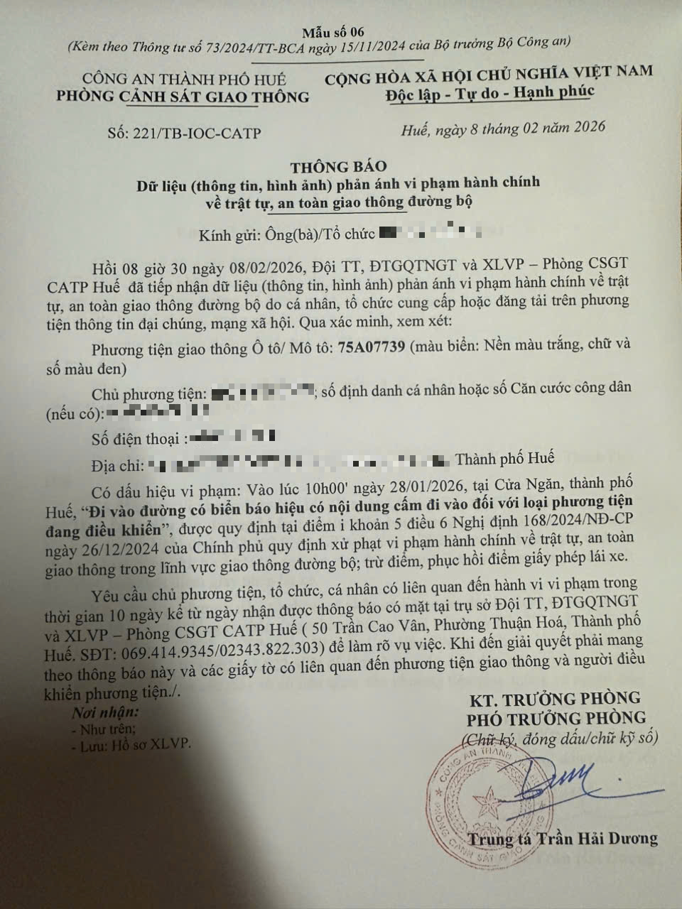 Qua hình ảnh phản ánh, người điều khiển phương tiện BKS 75A07739 có dấu hiệu vi phạm lỗi: Đi vào đường có biển báo hiệu có nội dung cấm đi vào đối với loại phương tiện đang điều khiển, quy định tại điểm i, khoản 5, điều 6 Nghị định số 168/2024/NĐ-CP ngày 26/12/2024 của Chính phủ quy định xử phạt vi phạm hành chính về trật tự, an toàn giao thông trong lĩnh vực giao thông đường bộ; trừ điểm, phục hồi điểm giấy phép lái xe.