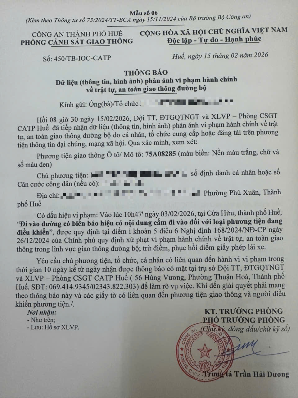 Vào lúc 10 giờ 47 phút, ngày 03/02/2026 ô tô mang biển kiểm soát 75A08285 đi vào đường cấm, giờ cấm khi tham gia giao thông tại Cửa Hữu (In) (Hướng vào Yết Kiêu)