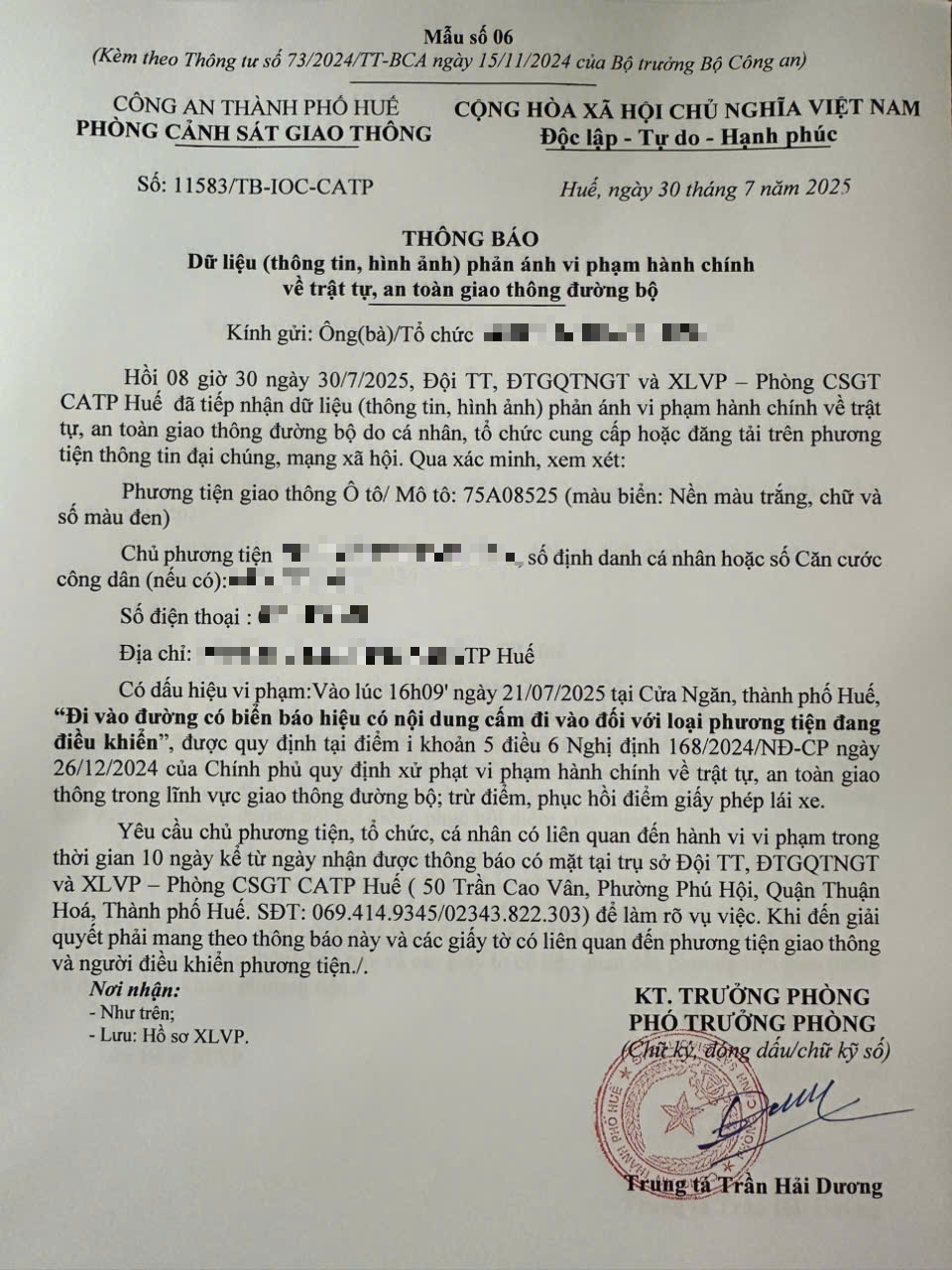 Qua hình ảnh phản ánh, người điều khiển phương tiện BKS 75A08525 có dấu hiệu vi phạm lỗi: Đi vào đường có biển báo hiệu có nội dung cấm đi vào đối với loại phương tiện đang điều khiển, quy định tại điểm i, khoản 5, điều 6 Nghị định số 168/2024/NĐ-CP ngày 26/12/2024 của Chính phủ quy định xử phạt vi phạm hành chính về trật tự, an toàn giao thông trong lĩnh vực giao thông đường bộ; trừ điểm, phục hồi điểm giấy phép lái xe.