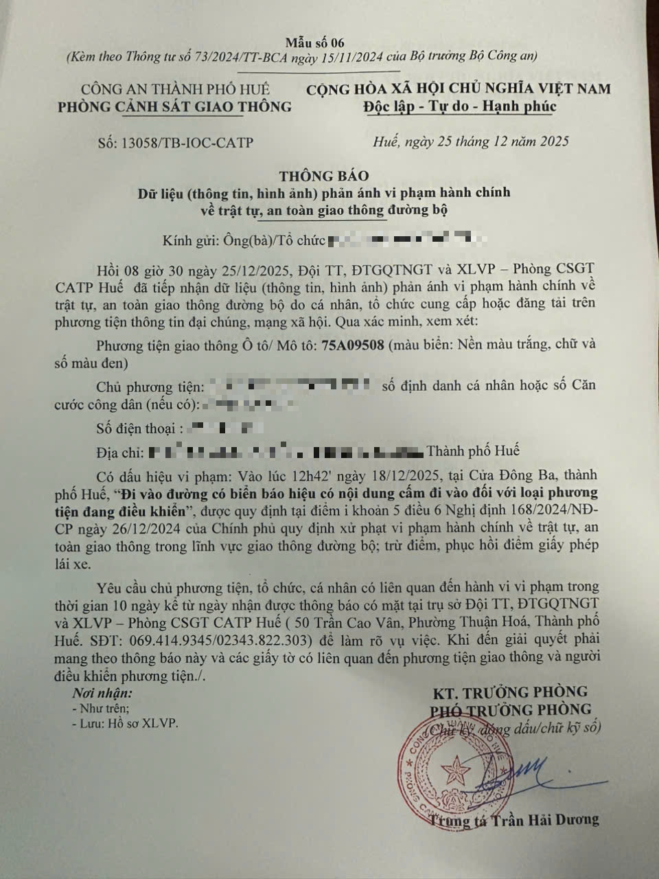 Qua hình ảnh phản ánh, Phòng Cảnh sát giao thông xác định lỗi vi phạm của người điều khiển phương tiện 75A09508 như sau: Đi vào đường có biển báo hiệu có nội dung cấm đi vào đối với loại phương tiện đang điều khiển, được quy định tại Điểm i khoản 5 Điều 6 Nghị định số 168/2024/NĐ-CP ngày 26/12/2024 của Chính phủ.