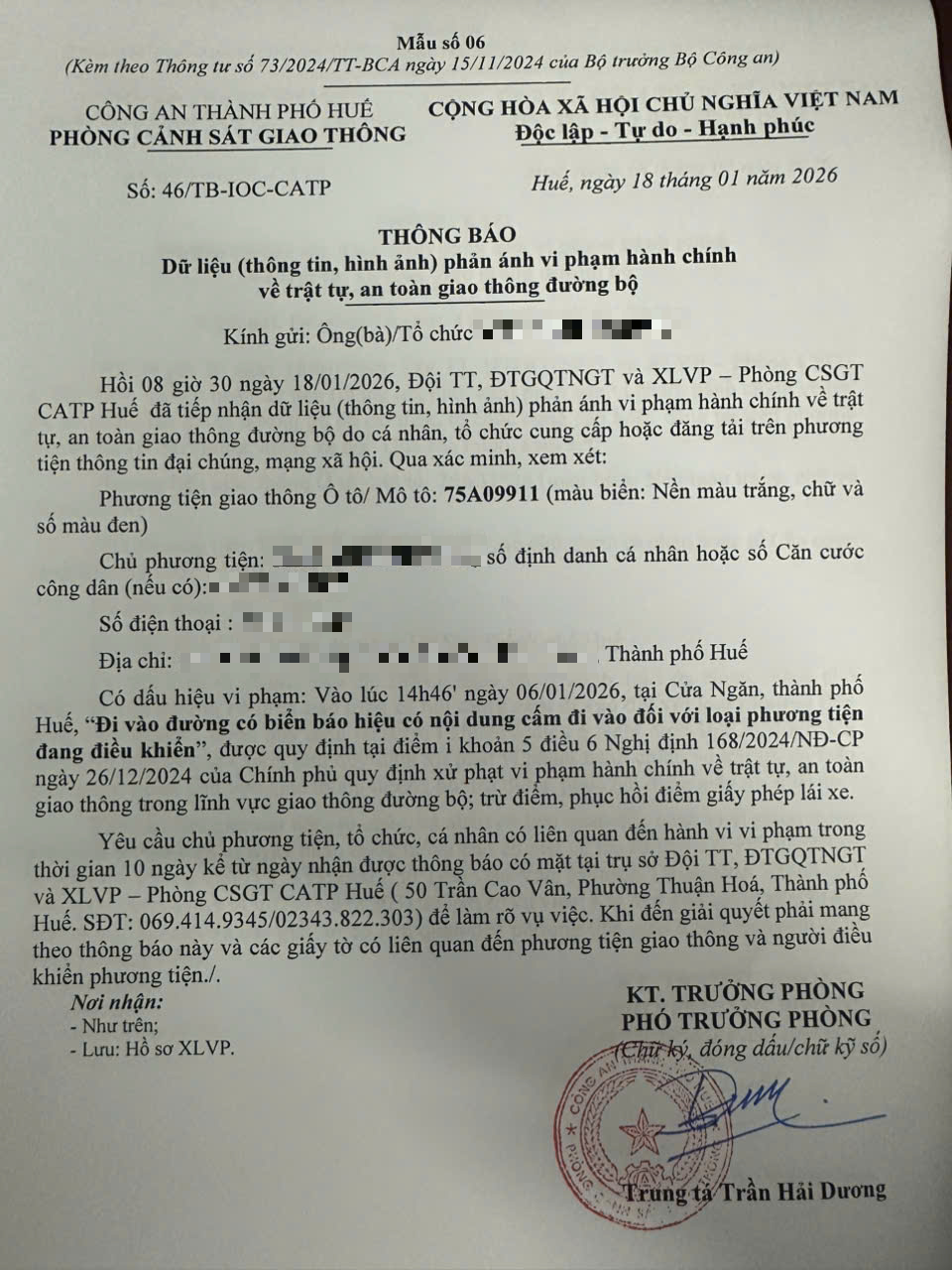 Qua hình ảnh phản ánh, Phòng Cảnh sát giao thông xác định lỗi vi phạm của người điều khiển phương tiện 75A09911 như sau: Đi vào đường có biển báo hiệu có nội dung cấm đi vào đối với loại phương tiện đang điều khiển, được quy định tại Điểm i khoản 5 Điều 6 Nghị định số 168/2024/NĐ-CP ngày 26/12/2024 của Chính phủ.