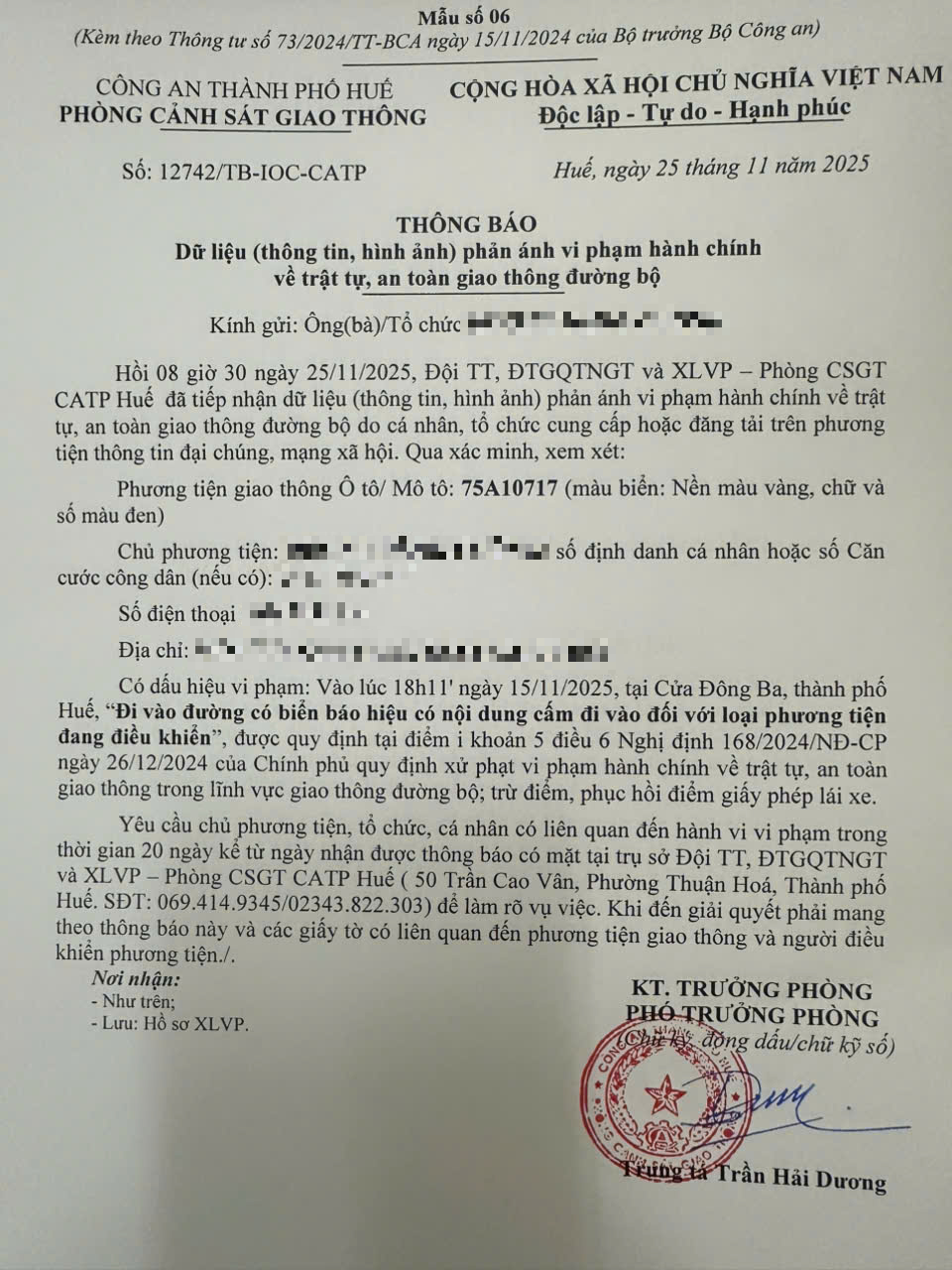 Qua hình ảnh phản ánh, Phòng Cảnh sát giao thông xác định lỗi vi phạm của người điều khiển phương tiện 75A10717 như sau: Đi vào đường có biển báo hiệu có nội dung cấm đi vào đối với loại phương tiện đang điều khiển, được quy định tại Điểm i khoản 5 Điều 6 Nghị định số 168/2024/NĐ-CP ngày 26/12/2024 của Chính phủ.