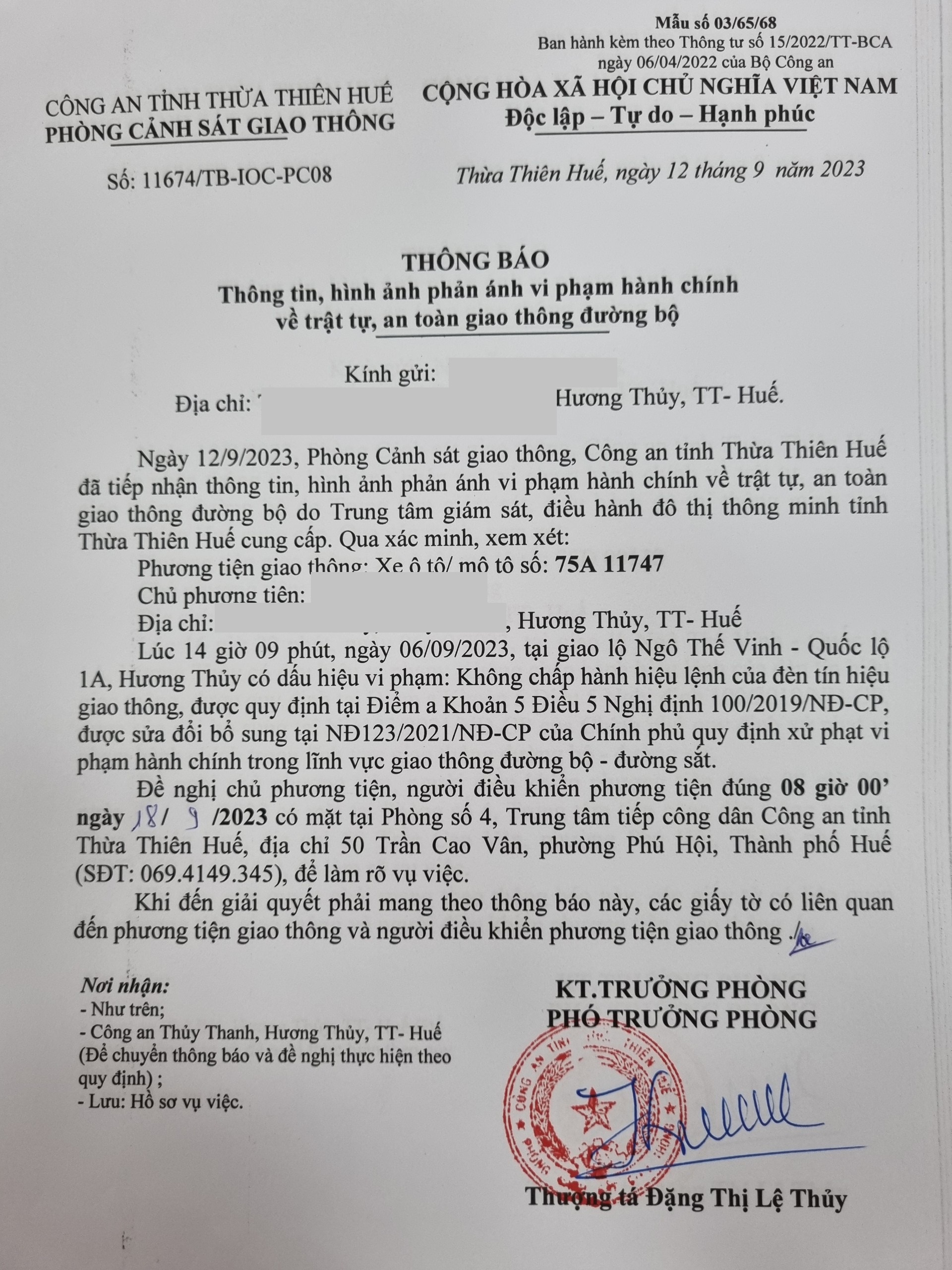 Phòng Cảnh sát giao thông đã lập hồ sơ, thông báo chủ phương tiện làm việc. Tuy nhiên, hiện chủ phương tiện vẫn chưa trình diện tại cơ quan. Phòng Cảnh sát giao thông sẽ gửi thông báo cho cơ quan đăng kiểm để đưa phương tiện vào cảnh báo trên Chương trình Quản lý kiểm định.