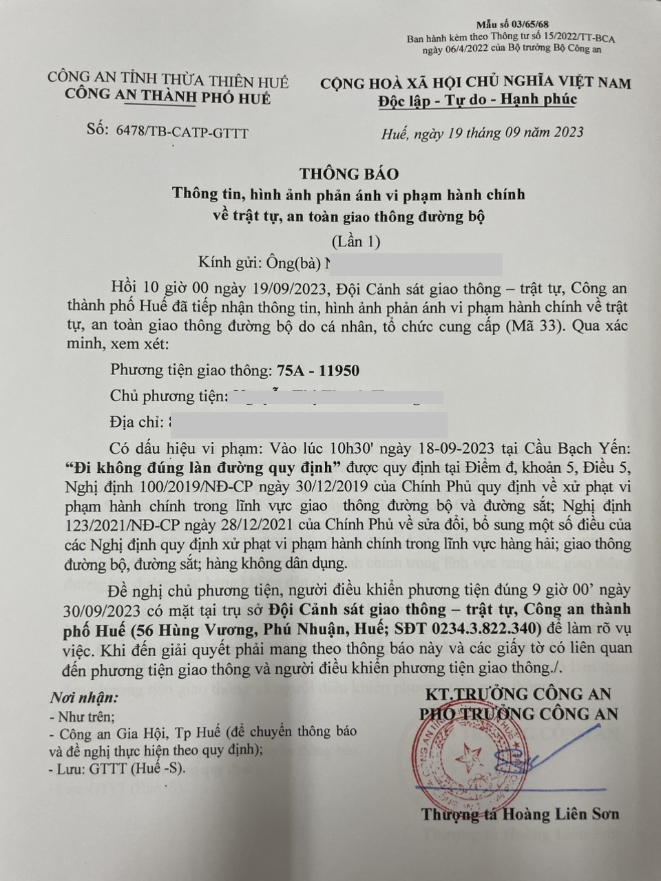 Công an thành phố cập nhật kết quả: Qua xác minh làm việc với chủ phương tiện vi phạm lỗi: Không chấp hành hiệu lệnh, chỉ dẫn của vạch kẻ đường, quy định tại điểm a, khoản 1, điều 5 Nghị định 100/2019/NĐ-CP được sửa đổi, bổ sung tại Nghị định 123/NĐ-CP ngày 28/12/2021. Ra Quyết định xử phạt 350.000đ. (Đính kèm Quyết định)