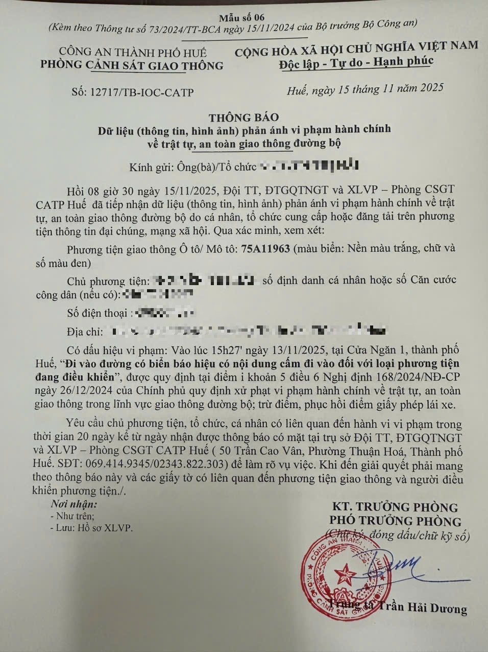 Qua hình ảnh phản ánh, Phòng Cảnh sát giao thông xác định lỗi vi phạm của người điều khiển phương tiện 75A11963 như sau: Đi vào đường có biển báo hiệu có nội dung cấm đi vào đối với loại phương tiện đang điều khiển, được quy định tại Điểm i khoản 5 Điều 6 Nghị định số 168/2024/NĐ-CP ngày 26/12/2024 của Chính phủ.
