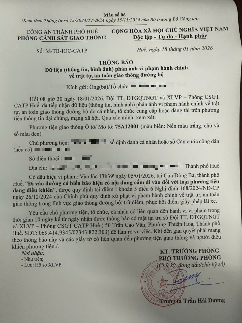 Qua hình ảnh phản ánh, Phòng Cảnh sát giao thông xác định lỗi vi phạm của người điều khiển phương tiện 75A12001 như sau: Đi vào đường có biển báo hiệu có nội dung cấm đi vào đối với loại phương tiện đang điều khiển, được quy định tại Điểm i khoản 5 Điều 6 Nghị định số 168/2024/NĐ-CP ngày 26/12/2024 của Chính phủ.