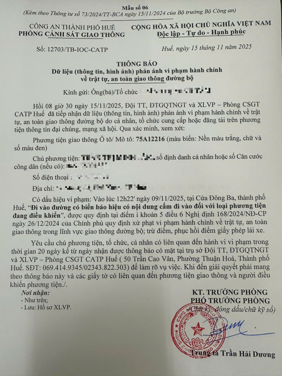 Qua hình ảnh phản ánh, Phòng Cảnh sát giao thông xác định lỗi vi phạm của người điều khiển phương tiện 75A12216 như sau: Đi vào đường có biển báo hiệu có nội dung cấm đi vào đối với loại phương tiện đang điều khiển, được quy định tại Điểm i khoản 5 Điều 6 Nghị định số 168/2024/NĐ-CP ngày 26/12/2024 của Chính phủ.