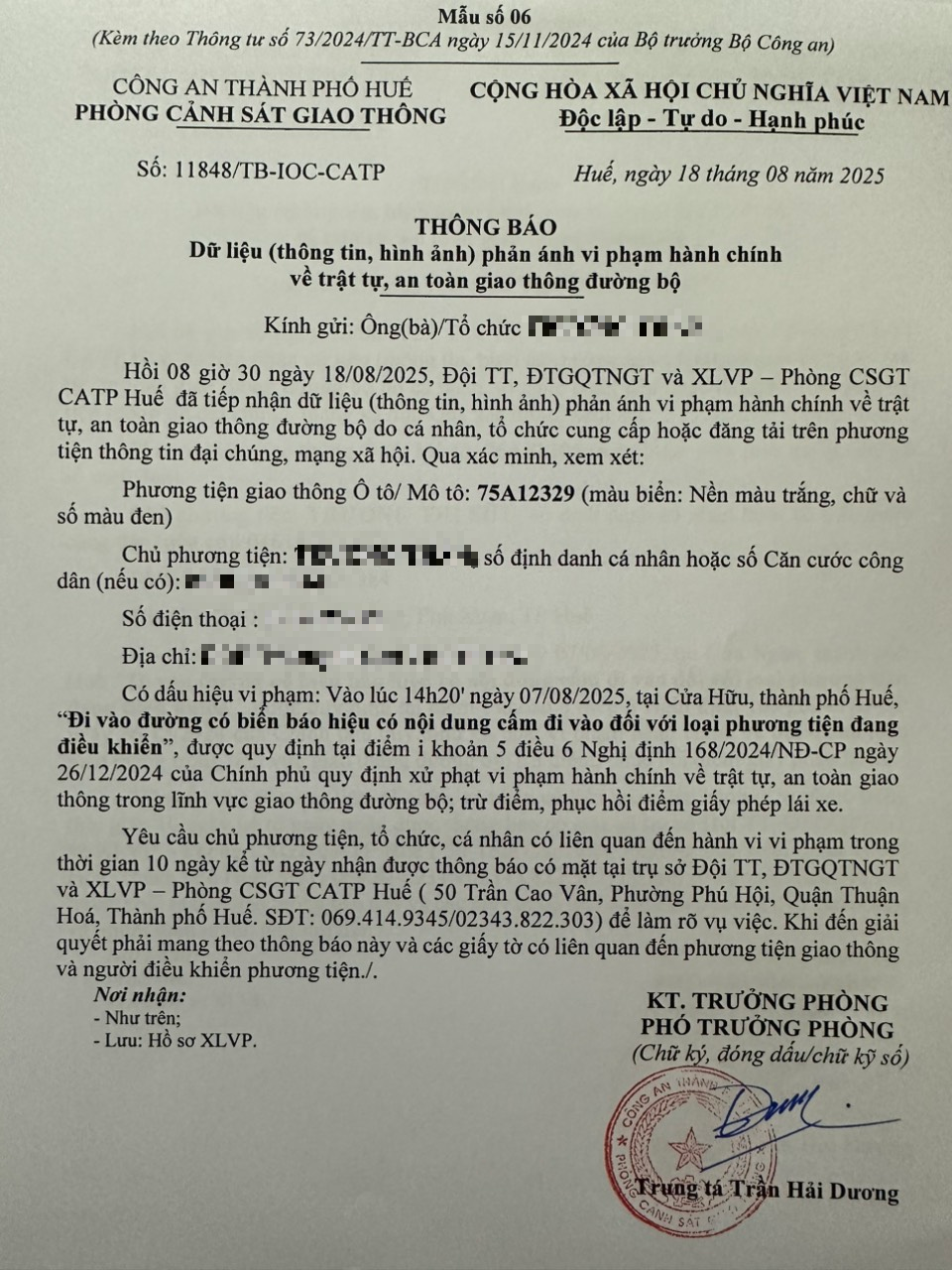 Qua hình ảnh phản ánh, Phòng Cảnh sát giao thông xác định lỗi vi phạm của người điều khiển phương tiện 75A12329 như sau: Đi vào đường có biển báo hiệu có nội dung cấm đi vào đối với loại phương tiện đang điều khiển, được quy định tại Điểm i khoản 5 Điều 6 Nghị định số 168/2024/NĐ-CP ngày 26/12/2024 của Chính phủ.