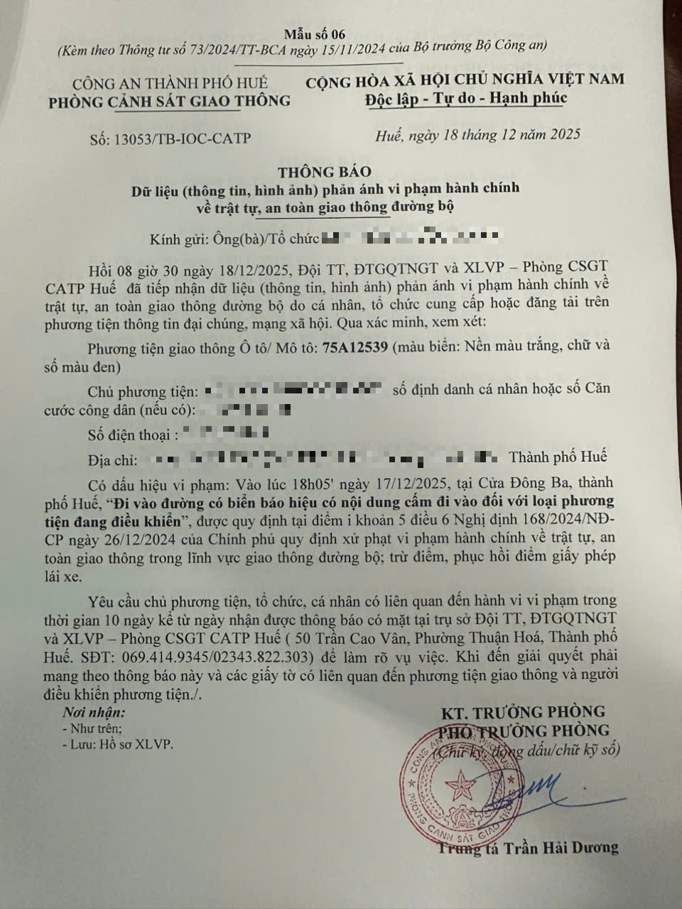 Qua hình ảnh phản ánh, Phòng Cảnh sát giao thông xác định lỗi vi phạm của người điều khiển phương tiện 75A12539 như sau: Đi vào đường có biển báo hiệu có nội dung cấm đi vào đối với loại phương tiện đang điều khiển, được quy định tại Điểm i khoản 5 Điều 6 Nghị định số 168/2024/NĐ-CP ngày 26/12/2024 của Chính phủ.