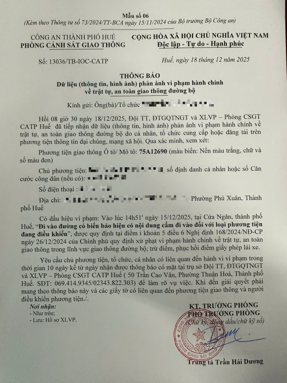 Qua hình ảnh phản ánh, Phòng Cảnh sát giao thông xác định lỗi vi phạm của người điều khiển phương tiện 75A12690 như sau: Đi vào đường có biển báo hiệu có nội dung cấm đi vào đối với loại phương tiện đang điều khiển, được quy định tại Điểm i khoản 5 Điều 6 Nghị định số 168/2024/NĐ-CP ngày 26/12/2024 của Chính phủ.