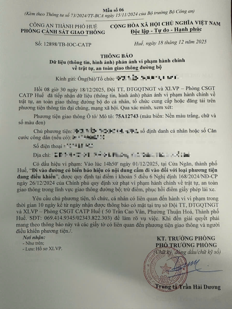 Qua hình ảnh phản ánh, Phòng Cảnh sát giao thông xác định lỗi vi phạm của người điều khiển phương tiện 75A12743 như sau: Đi vào đường có biển báo hiệu có nội dung cấm đi vào đối với loại phương tiện đang điều khiển, được quy định tại Điểm i khoản 5 Điều 6 Nghị định số 168/2024/NĐ-CP ngày 26/12/2024 của Chính phủ.