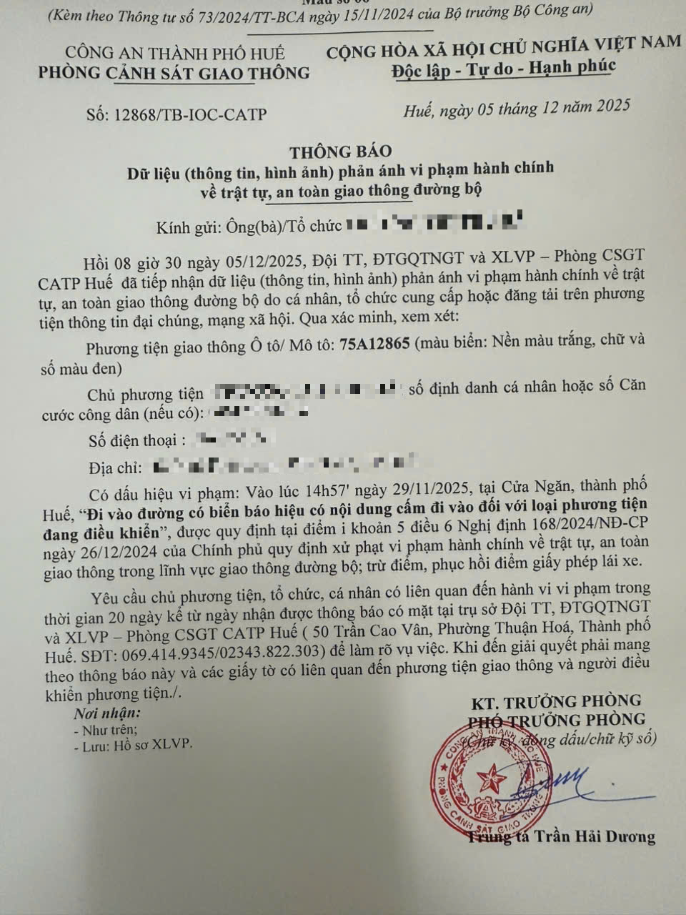 Qua hình ảnh phản ánh, Phòng Cảnh sát giao thông xác định lỗi vi phạm của người điều khiển phương tiện 75A12865 như sau: Đi vào đường có biển báo hiệu có nội dung cấm đi vào đối với loại phương tiện đang điều khiển, được quy định tại Điểm i khoản 5 Điều 6 Nghị định số 168/2024/NĐ-CP ngày 26/12/2024 của Chính phủ.
