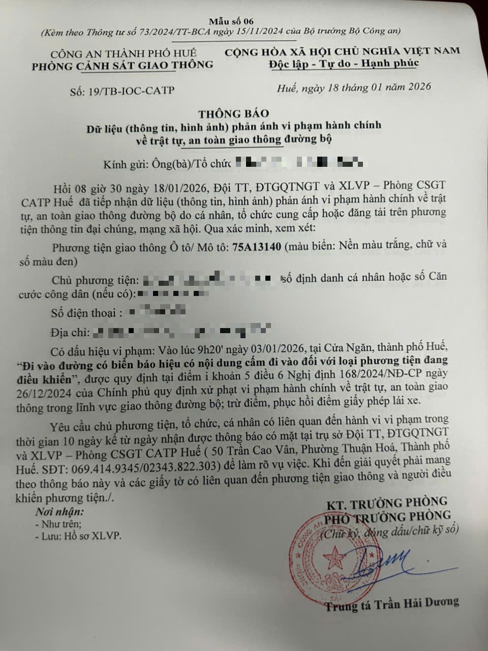 Qua hình ảnh phản ánh, Phòng Cảnh sát giao thông xác định lỗi vi phạm của người điều khiển phương tiện 75A13140 như sau: Đi vào đường có biển báo hiệu có nội dung cấm đi vào đối với loại phương tiện đang điều khiển, được quy định tại Điểm i khoản 5 Điều 6 Nghị định số 168/2024/NĐ-CP ngày 26/12/2024 của Chính phủ.