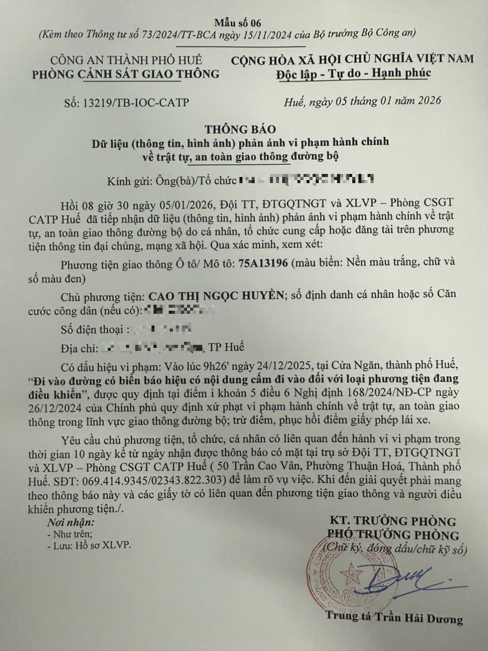 Qua hình ảnh phản ánh, Phòng Cảnh sát giao thông xác định lỗi vi phạm của người điều khiển phương tiện 75A13196 như sau: Đi vào đường có biển báo hiệu có nội dung cấm đi vào đối với loại phương tiện đang điều khiển, được quy định tại Điểm i khoản 5 Điều 6 Nghị định số 168/2024/NĐ-CP ngày 26/12/2024 của Chính phủ.
